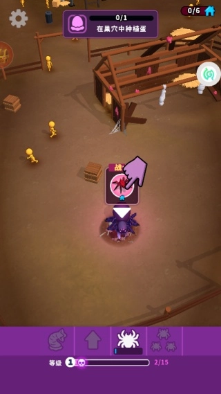 1、玩家需要在荒凉的地形中寻找食物和资源,如昆虫、小动物等,以维持蜘蛛的生命力。 2、为了躲避天敌和恶劣环境,玩家需要建造庇护所。庇护所不仅可以提供安全的休息场所,还可以用于孵化后代。 3、通过收集资源和经验值,玩家可以进化蜘蛛的身体部位,如蜘蛛丝、钳子、脚等,提升蜘蛛的生存能力。
