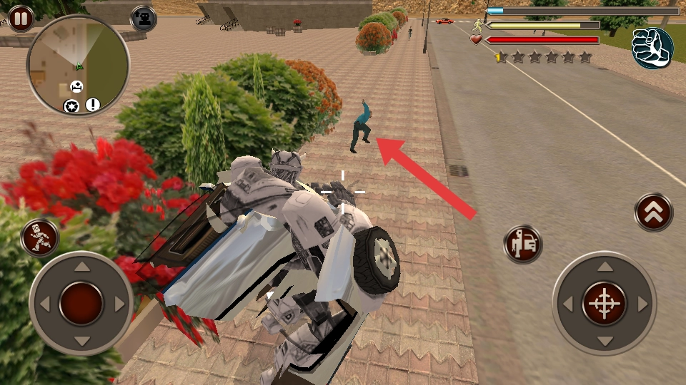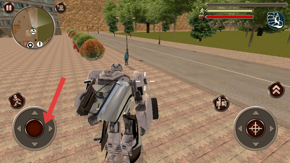1. 进入游玩页面后,操控机器人在城市街道上移动。通过左侧摇杆来控制方向,当碰到行人或车辆时能够进行互动,借此熟悉基础的移动与交互操作。