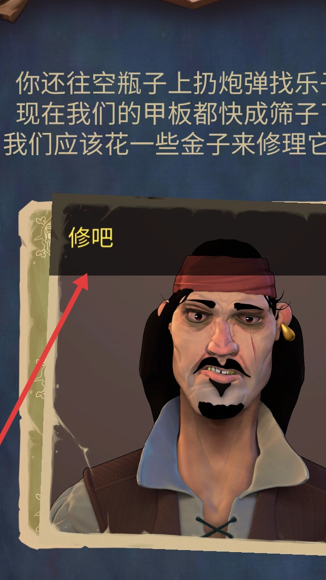 3、面对甲板破损,移动选项卡片到修这一选项,消耗金子修理甲板,增加船只的耐久度。