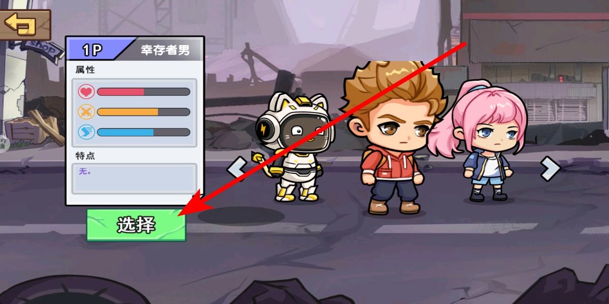 2、角色选择界面,看到不同的角色,比如带有属性展示的幸存者男等,挑选好想要操控的角色后,点击选择,便可确定角色,进入求生场景。