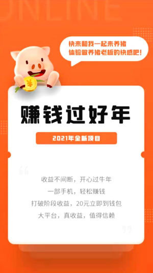 在线就能利用零碎时间照料小猪,助你走上发家致富之路!玩法超简单,人人都能轻松上手。玩家在线完成任务,把小猪合成升级,就能获取更高收益,快来加入吧!