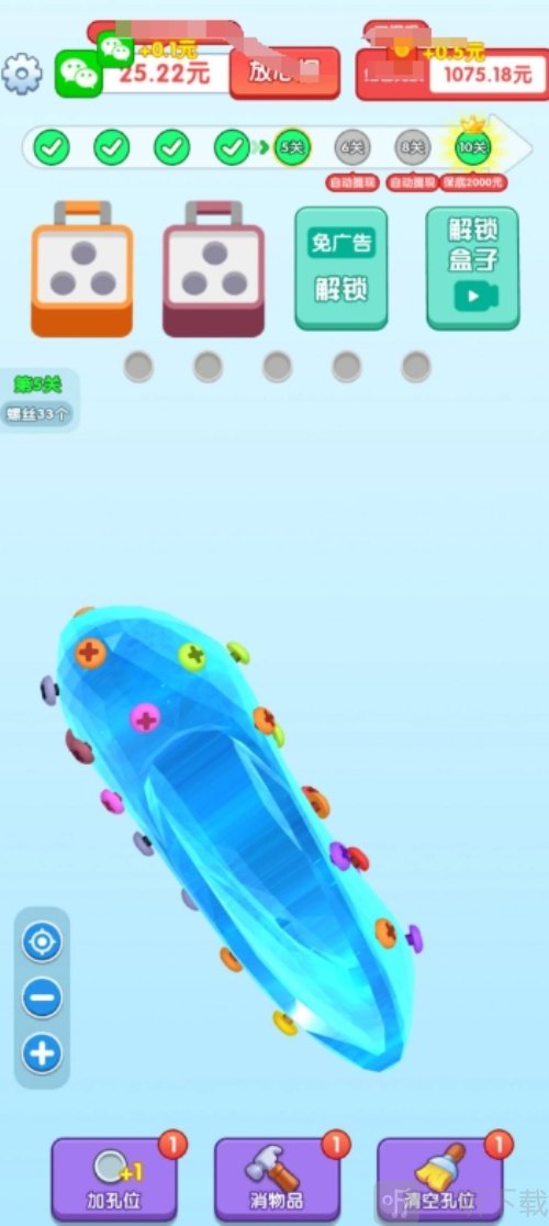2. 玩家需要消除制定颜色的螺丝,消除完所有的螺丝即可开启新关卡。