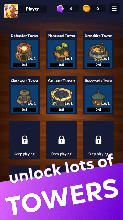 防御塔升级:在每场战斗中获得奖励,并使用它们来升级您的防御塔并改进您的甲板,使您的防御更强大,用途更广泛。