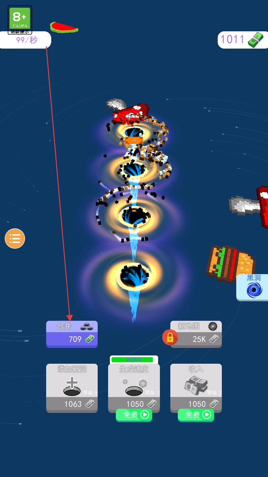 3、积累资源后,点击【合并-709】,融合黑洞,解锁更高等级。