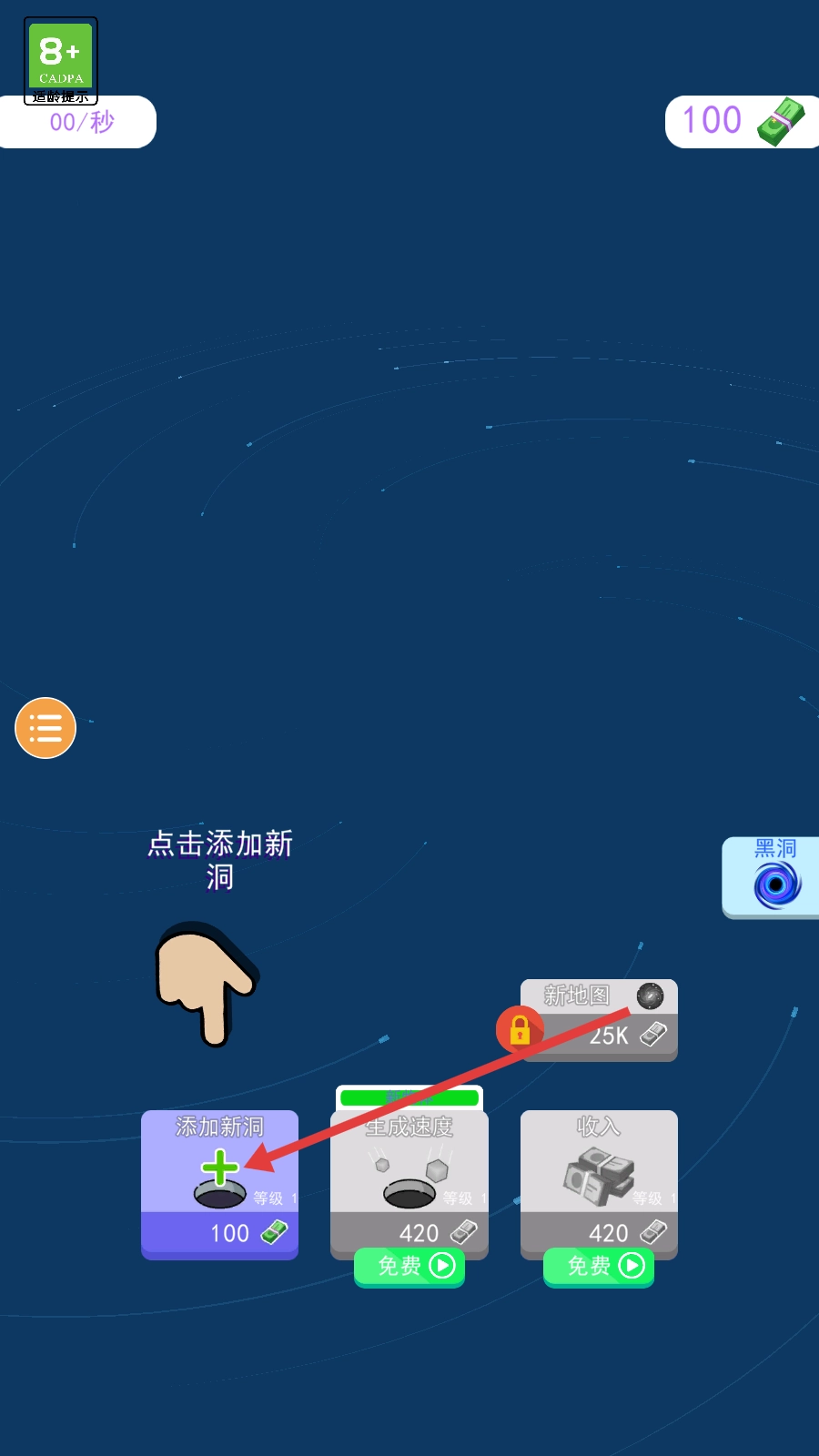 2、消耗货币点击【添加新洞等级1】,增加黑洞数量,提升收益。