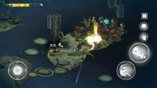 3、左侧虚拟摇杆控制角色移动,右侧提供攻击、翻滚以及互动按钮,上方还有背包管理功能,左上角则显示生命值状态。