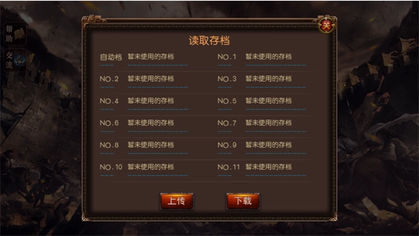2、进入游戏后你可以征战沙场,回阵杀敌,音乐设置等等,你可以读取存档,上传存档,你可以设置音乐大小;