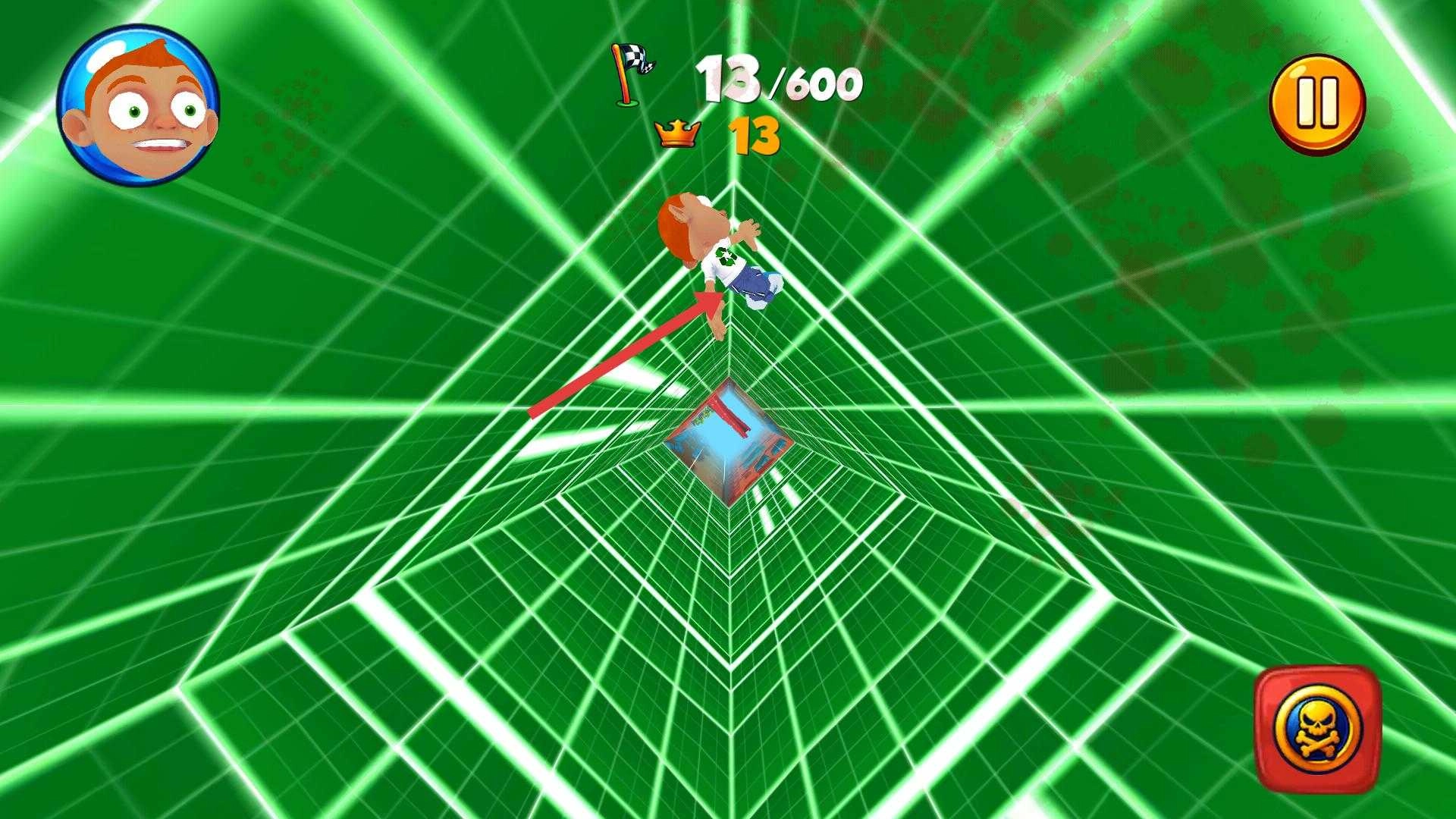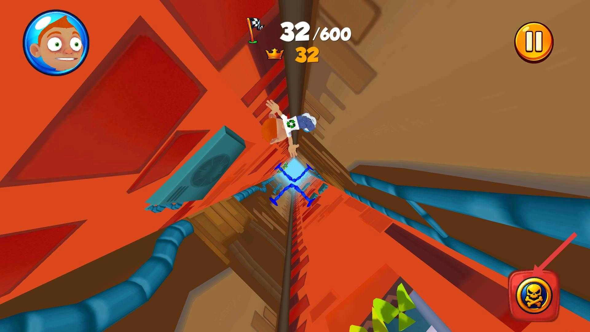 3、当下落到红色场景的通道时,继续灵活操控角色,躲避各类障碍,还可利用右下角的功能按钮,助力游戏进程。