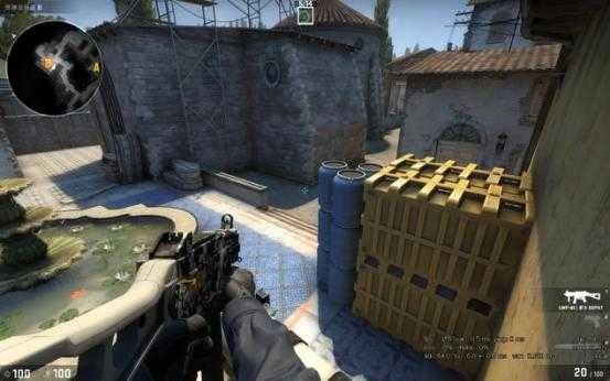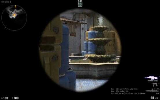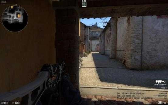 当T进攻B点断后的时候,站这里比贴墙好的原因是因为地图的改动,香蕉道门口两边都可以站人,此时如果对手稍有头脑就会先看右边(图中准星瞄准的地方)再来检查左边,此时你完全可以提前半个身位知道他的动向。
