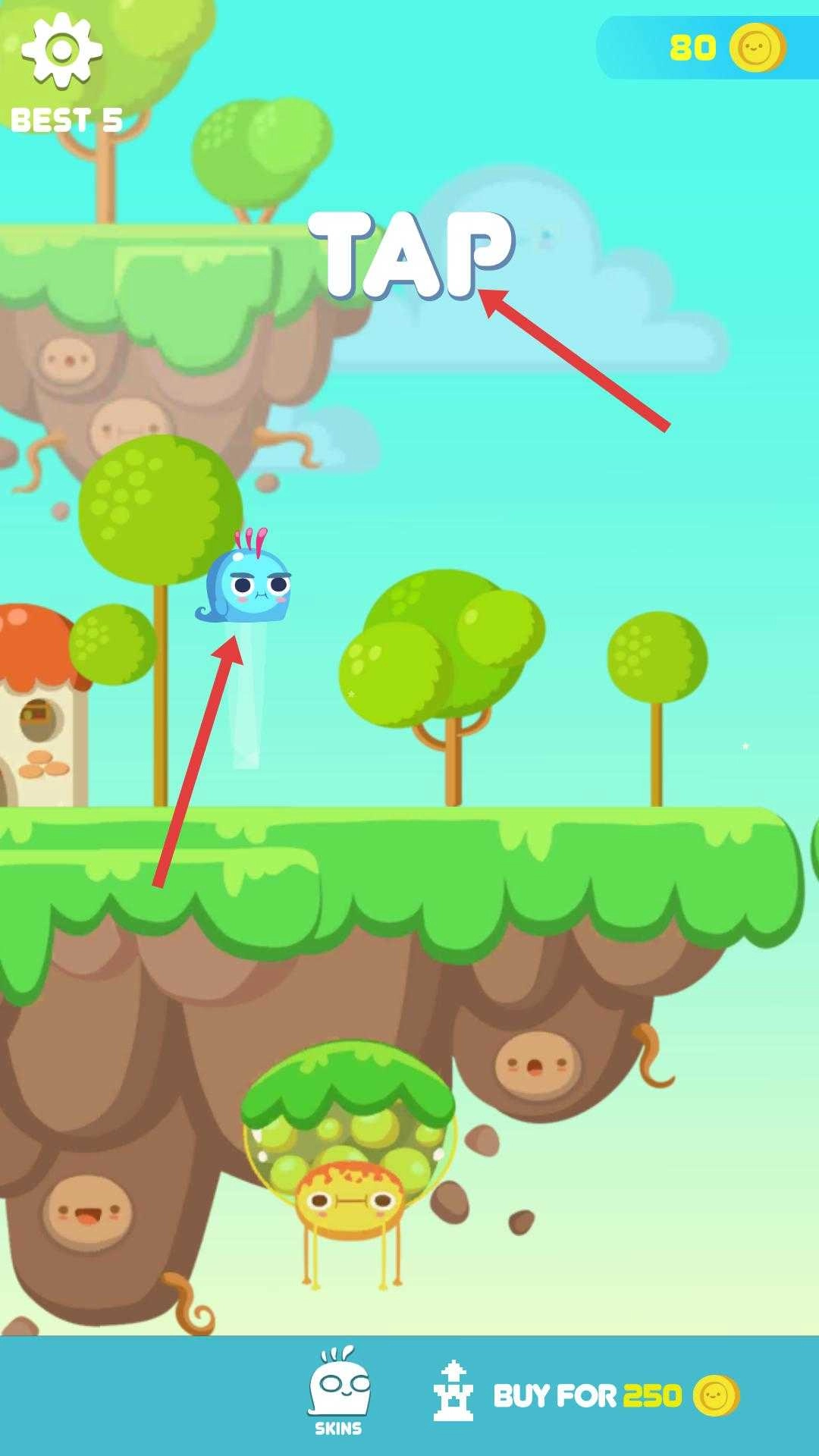 1游戏开启后,会出现TAP提示,此时点击屏幕,蓝色小生物便会向上跳跃前行,从而开启冒险之旅。需留意点击的时机。