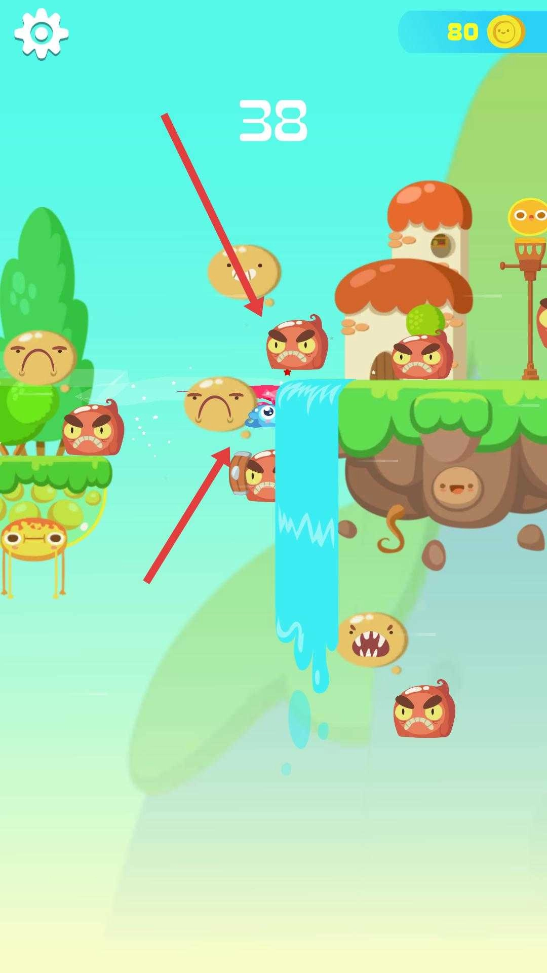 3、遇到红色等表情凶狠的生物,要灵活躲避避免碰撞,同时利用场景中的瀑布等元素,巧妙通过危险区域。