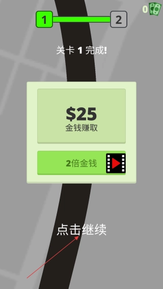 4、完成关卡后,会显示赚取的金钱数量。可以选择2倍金钱来获得双倍奖励,也可点击点击继续,进入下一个关卡。