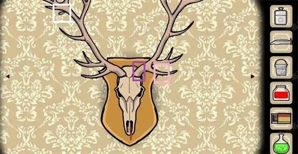鹿先生右上角绿框鹿头装饰放大后,先点击紫框,点到不能点了,再点击粉框,左边也会长出来,在白框处点击后长出植物,得到迷迭香。继续点击粉框,骷髅下面会滴出红色液体,用玻璃瓶装好得到塔巴斯科辣椒酱。