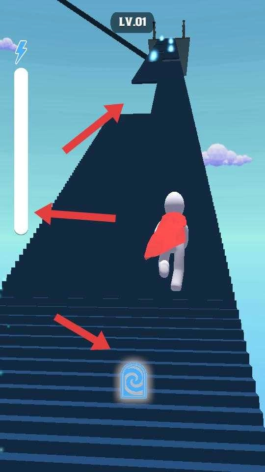 2、关卡场景中操控角色在阶梯状路径上移动,朝着目标区域前进,途中可留意特殊图标等元素。