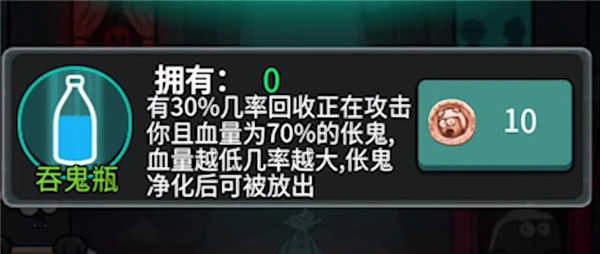 有这样一个道具,它有30%的几率能够回收处于攻击状态且血量为70%的伥鬼,而且伥鬼的血量越低,该道具成功回收的概率就越大。被回收的伥鬼经净化后能够再次被放出。