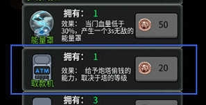 4、取款机:通过摆放炮台可以去偷取金币,获得去取款机即可偷取金币,从而达到升级效果,在商店中购买取款机。
