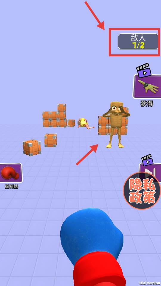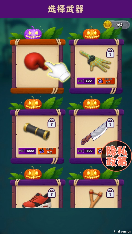 2、武器选择界面,选红色拳击手套(其他需更高金币/广告解锁)。