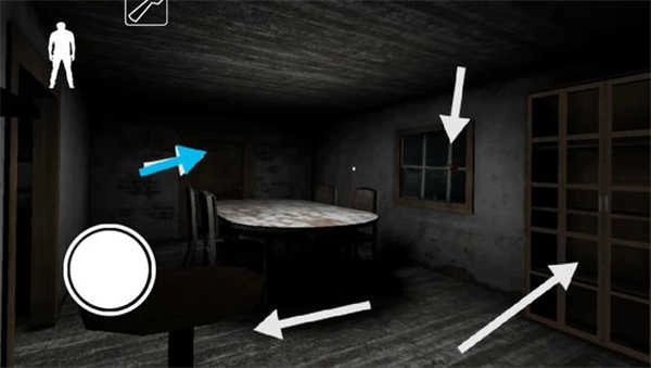 厨房的后面是餐厅。这里的椅子是不会被碰倒的,小桌和灯会被碰倒。有血手印的窗户可以翻过去来到后院,蓝色剪头标注的门只有Granny可以打开,一般是锁着的。