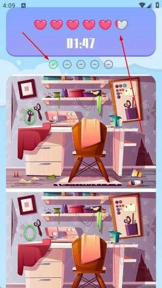 3、每找对一处差异点亮绿色对勾,注意剩余爱心与时间,完成关卡推进。
