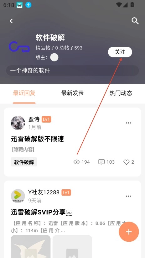 例如进入“软件”圈子,可以点击右上角关注,时刻关注动态