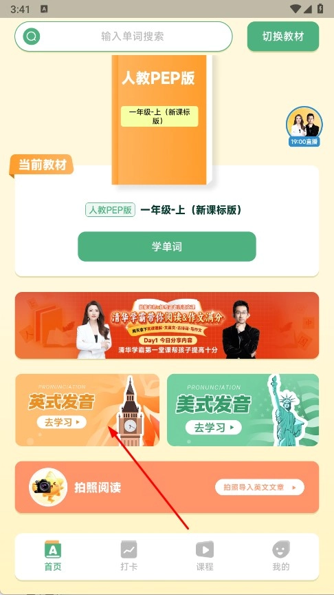 2、登录后进入首页,选教材,点英式发音学习音标。