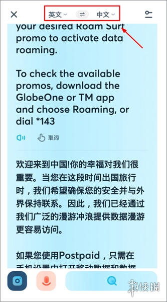 3、进入短信内容页面,自由选择需要翻译成哪种语言(系统默认设置为英文翻译成中文)。设置完成后,即可查看短信翻译内容。