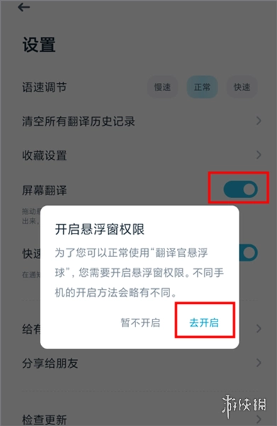 3、在【设置】页面中,找到并点击【屏幕翻译】功能,确保其处于开启状态,并点击【去开启】悬浮窗权限。