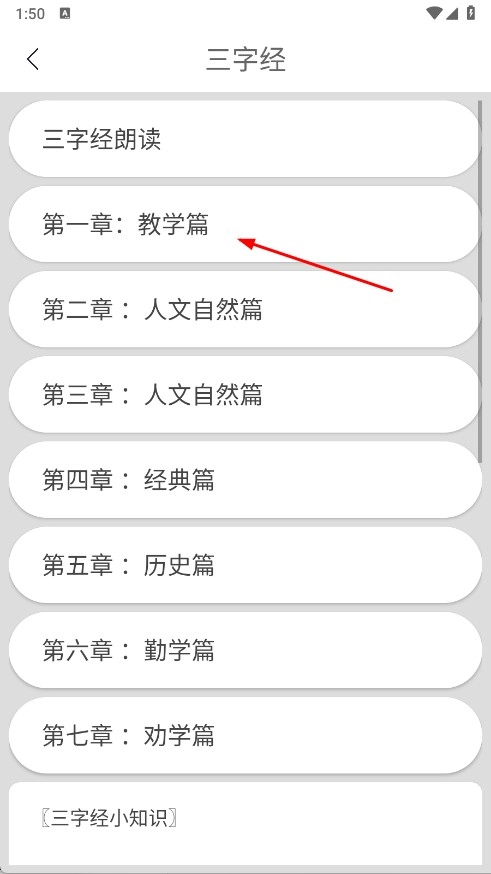 2、在三字经页,选择第一章教学篇,查看对应内容。