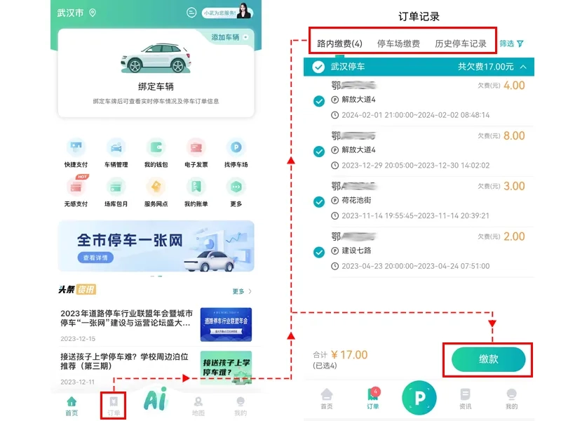 第四步:点击“订单”,可查看“路内缴费”、“停车场缴费”、“历史停车记录”等,勾选需要缴费的清单,点击“缴款”,完成线上缴费。