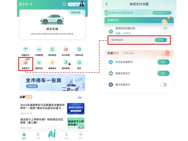 第五步:在首页点击“无感支付”-“开启”,即可享受即停即走,无感支付的便捷停车体验。