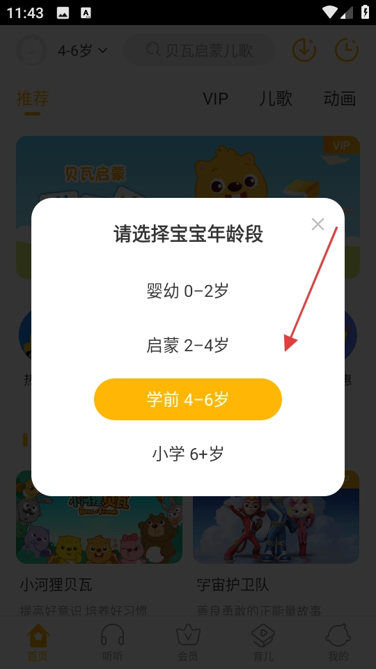 1、首先,让孩子自主点选合适的年龄段,例如学前4 - 6岁这一选项。完成选择后,界面会自动推送适宜的内容。这时,家长可以指着屏幕上的数字,和孩子一同数数,借此机会教他们认识不同的年龄段划分。