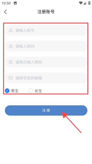 3、按提示输入账号、密码等信息,选择性别,点击【注册】按钮。
