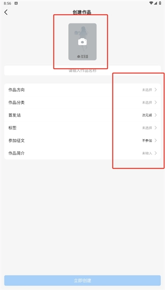 2.接着,选好要撰写的内容以及小说名称,随后点击创建。