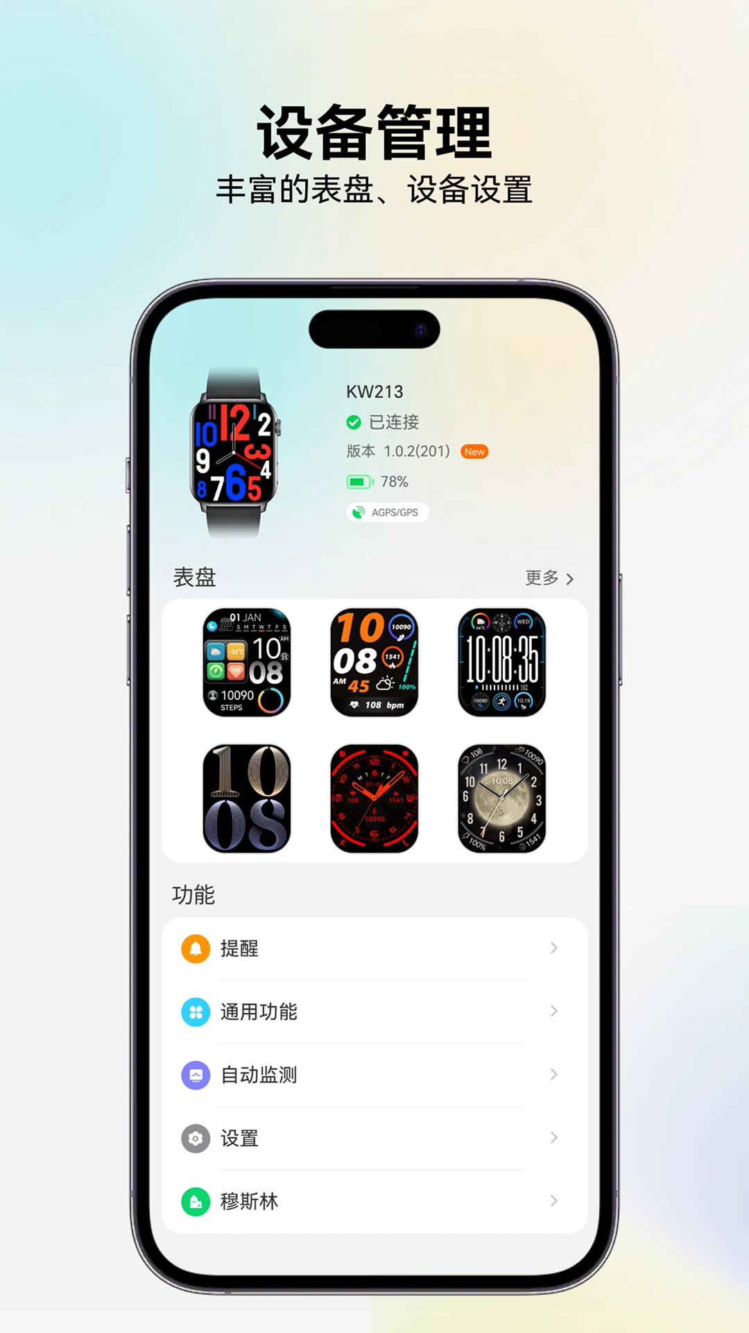 - 为手表设置闹钟、提醒事项,支持自定义表盘(提供海量表盘市场,支持DIY设计)。