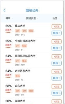5、院校优先填报:结合用户提供的成绩、位次,系统通过大数据分析对院校的录取风险系数、志愿的风险系数进行智能评估