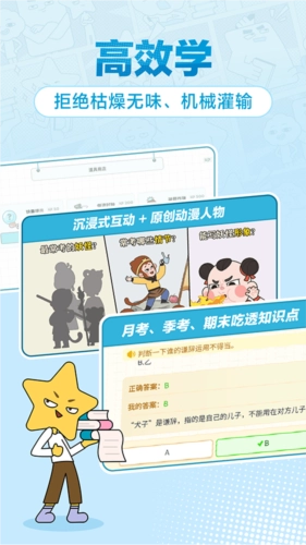 拒绝枯燥无味,沉浸式互动+原创动漫人物陪伴,学习更有成就感拒绝题海战术,针对性吃透知识点,让每一次练习都有用拒绝死记硬背,精选好题准确练习,以练代讲,变“被动听”为“主动学”