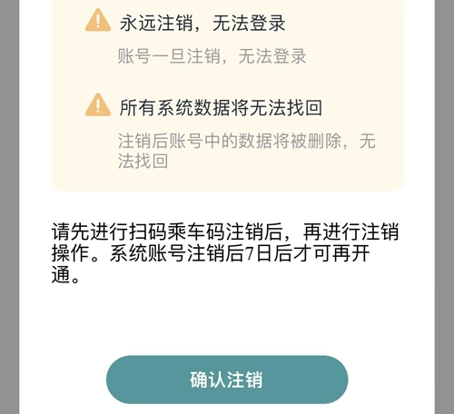 然后小编要提醒你们的就是账号注销有风险,1-永远注销、无法登录、2-所有的系统数据都无法找回。然后要提醒大家的就是如果要完成注销的话,你们首先需要把扫码乘车码注销掉之后再进行账号注销的。