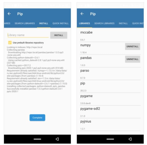 完成所有设置后,就可以开始使用pip像在PC上一样为项目安装软件包。Pydroid 3带有一个界面,可让您安装软件包而无需在终端中编写命令。