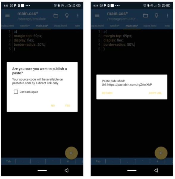 如果愿意,您可以在Pastebin平台上与他人分享您的知识和进步。为此,请点击应用程序左上角的三个菜单图标。接下来,选择Pastebin并点击是。在弹出的下一个菜单上,点击“复制URL”将链接复制到您的源代码。