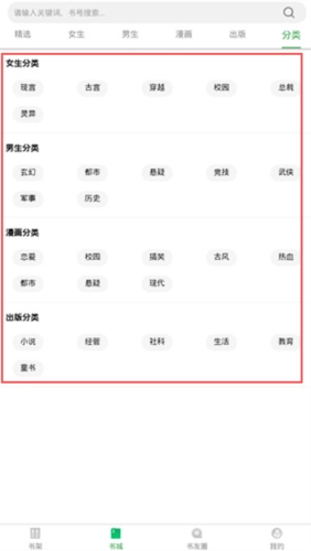 3、点开书城,有精选、女生、男生、漫画、出版等;