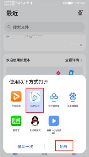 4、选择EVPlayer,点击始终。
