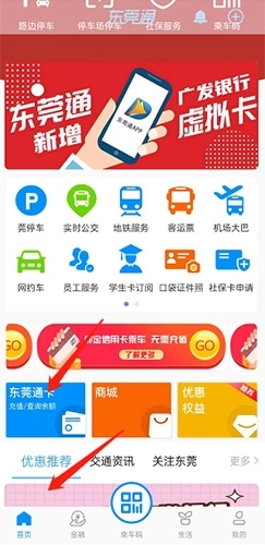 1、打开软件,点击底端的“首页”选项,然后点击“东莞通卡”选项。