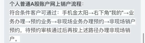 如果想要在金太阳注销账号的话,我们可以分作两种情况进行考虑,一种是【个人普通A股账户】,另外一种是【个人普通账户】。首先小编要介绍的就是【个人普通A股账户】注销的流程,符合条件要求的客户可以打开软件点击右下角的【我的】-【业务办理】-【预约业务】-【非现场业务办理预约】-【非现场销户预约】,待预约审核通过之后,再按照上述路径去办理非现场销户就可以了。