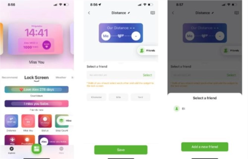 一旦你们都成为该应用上的朋友,你将需要选择你的小部件并进行设置。在应用程序中,点击屏幕底部的探索。例如,选择一个像矩形距离这样的小部件。选择你要与之一起使用的朋友,然后点击保存。