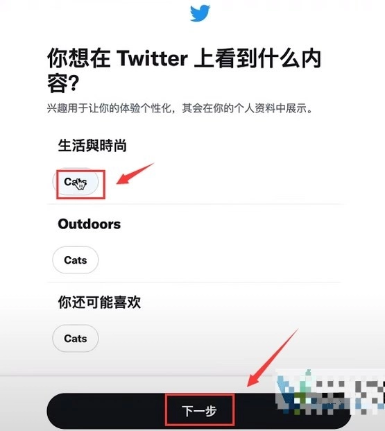 8、这里你可以选择喜欢在推特上面看到的内容,我们根据自己的爱好进行选择,选择好过后点击“下一步”。