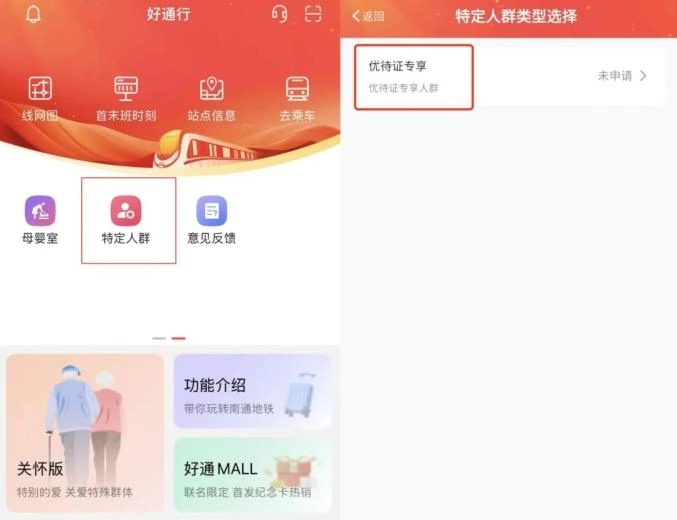 2、点击“首页”选择“特定人群”栏目点击“优待证专享”进入申请开通界面按照系统提示进行申请。