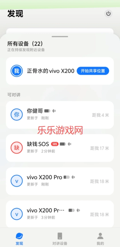 在“发现”页自动搜索附近开启对讲机的设备,或通过地图定位查找。