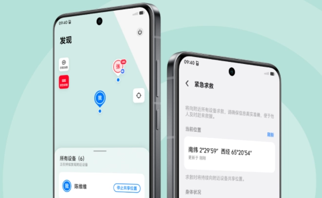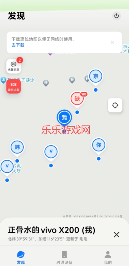 SOS紧急求救:在“发现”页点击左上角SOS,选择身体状况后发送求救信号,附近设备可接收。