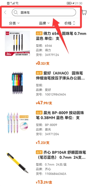 2、在办公商品页输入目标品名,也可按品牌或价格进一步筛选。