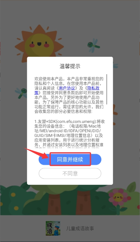 1. 当首次启动应用时,需在温馨提示的弹窗中点击“同意并继续”。